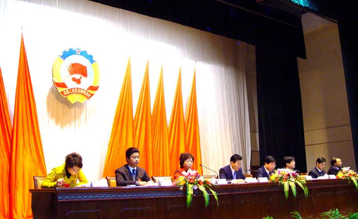 2009年1月4日启东市政协召开十三届二次会议预备会议,图为大会主席台。