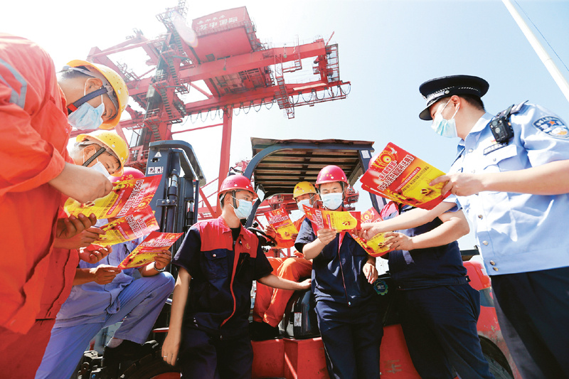 2020年8月19日,江苏省如皋市出入境边防检查站组织普法民警来到苏中国际码头开展“关注民法典 护航美好生活”主题宣传活动。 中新社发 章善玉/摄